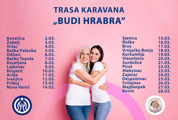 Karavan opremljen neophodnom opremom za dijagnostički pregled obilazi brojna mesta širom Srbije i omogućava ženama da urade besplatan ultrazvučni pregled dojki. Pošto je broj pregleda ograničen, sve zainteresovane mogu da se prijave za pregled u Karavanu od 11:30 do 12 časova u svom gradu, a prednost će imati žene koje nisu radile pregled više od 2 godine i mlađe su od 45 godina.